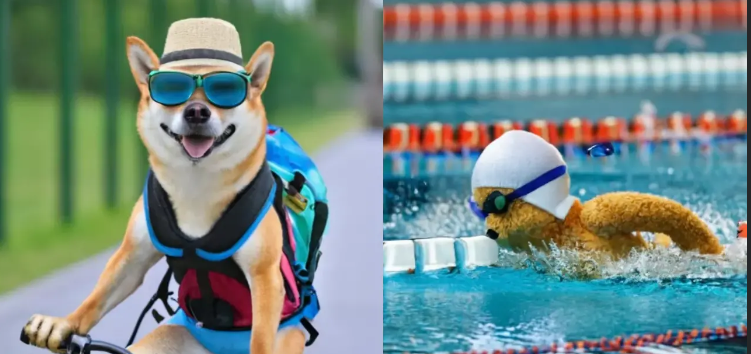 我说:一个骑自行车的土狗,一个游泳的泰迪熊。然后,人工智能就能画出对应的图。