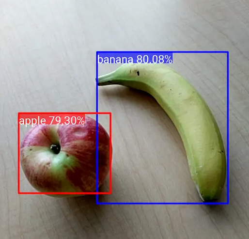 其二:目标检测。相比于分类,它又更进了一步,它可以找出哪个位置有什么物体。比如,红框是苹果,蓝框是香蕉。