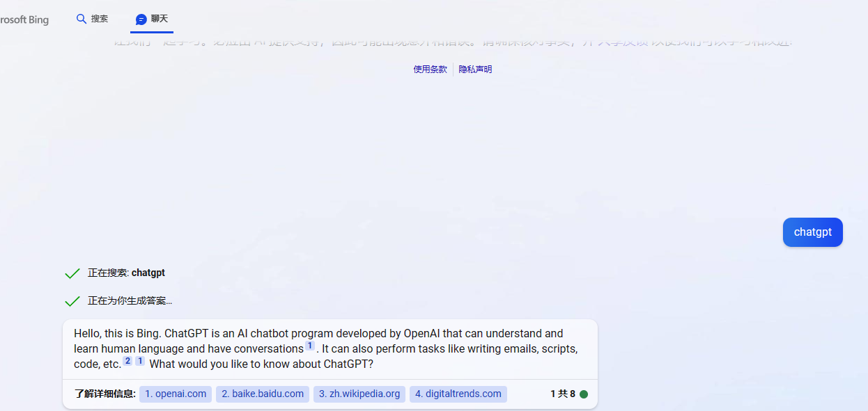 有两种使用方式,一种是正常搜索,右侧会展示new bing的结果 另一种是chat模式,点击chat会进入chat模式