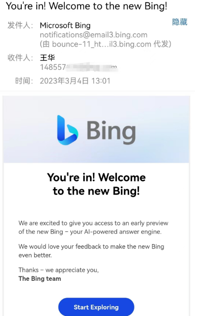 # 收到邮件,微软新必应(New Bing)能用了