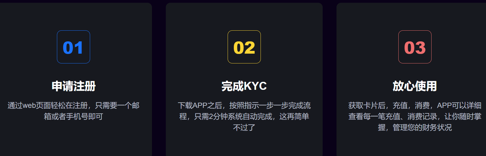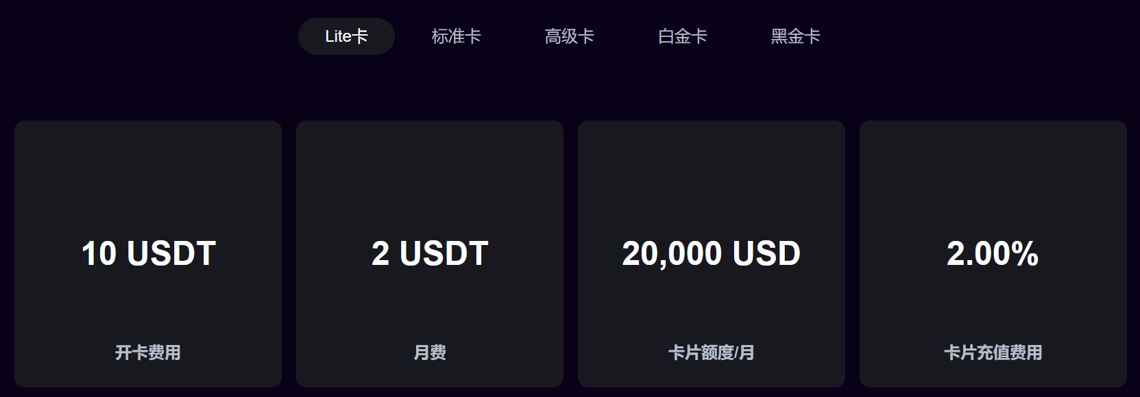 点击界面左上角的“申请卡”开通虚拟信用卡,开卡的时候可以选0开卡费的,也可以选10USDT开卡费(一次性)的,区别是0开卡费的需要你完成KYC认证(需要你上传身份证(国内身份证没问题或者护照认证),如果你暂时不想上传个人身份信息,可以先选10USDT开卡费的