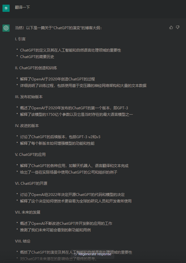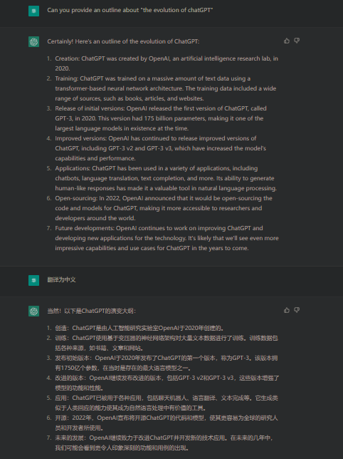 例如: 1.1 简单讲一讲ChatGPT的演化,可以这样问 Can you provide an outline about "the evolution of chatGPT"