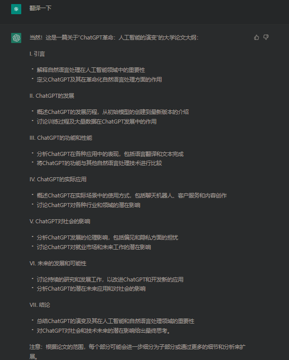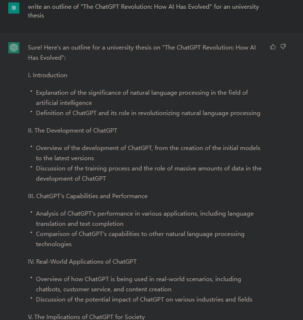 1.3 大学论文的概览(更详细),可以这样问: write an outline of "The ChatGPT Revolution: How AI Has Evolved" for an university thesis