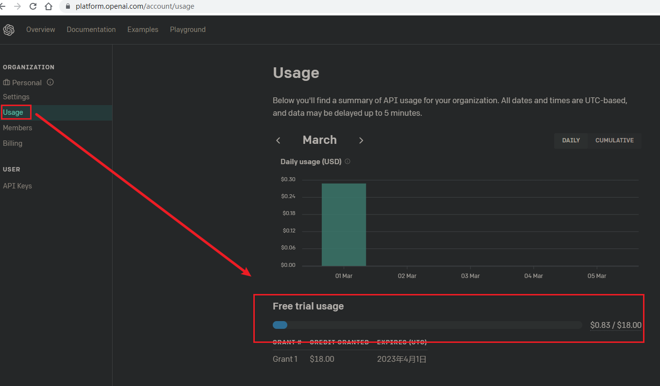 地址:https://platform.openai.com/account/usage 默认注册后获得可在3个月内使用的18美元的赠送额度