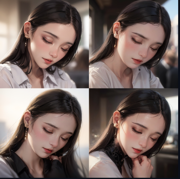 正向: (masterpiece:1.2, best quality), (real picture, intricate details),1girl, black_hair,white shirt, blurry, closed_eyes, closed_mouth, depth_of_field, earrings, face, forehead, jewelry, lips,artbook style, simple_background, solo 反向: (worst quality, low quality:1.4), negative_hand-neg, verybadimagenegative