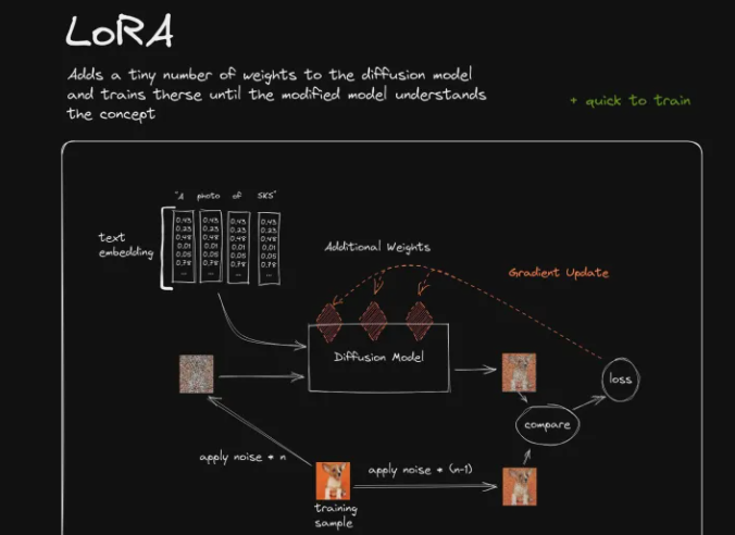 全称Low Rank Adaption,LoRA训练相较于Dreambooth更快且使用更少的VRAM,其数据大小相较于完整模型要小很多(150M左右);AI模型的内部实现如上