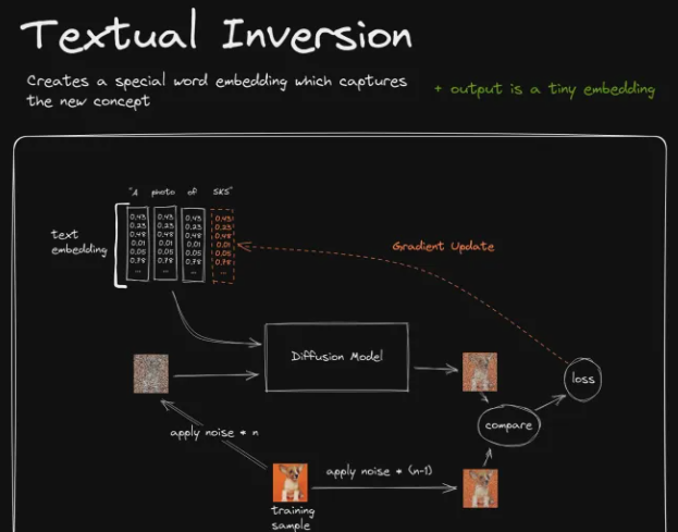 Gradient Update将作用于SKS在语言处理模型中对应的参数向量(Embedding Vector);通过训练,Textual Inversion为SKS关键词找到了一个最合适的向量