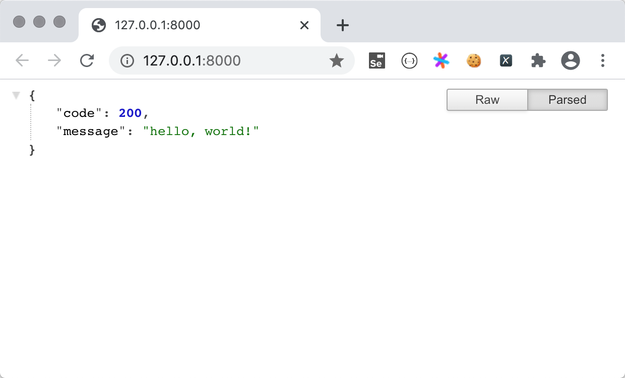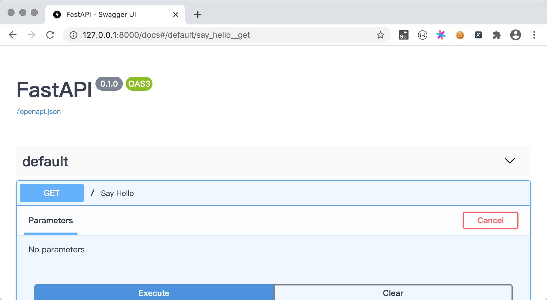 main.py。from fastapi import FastAPI app = FastAPI() @app.get('/') def say_hello(): return {'code': 200, 'message': 'hello, world!'}1