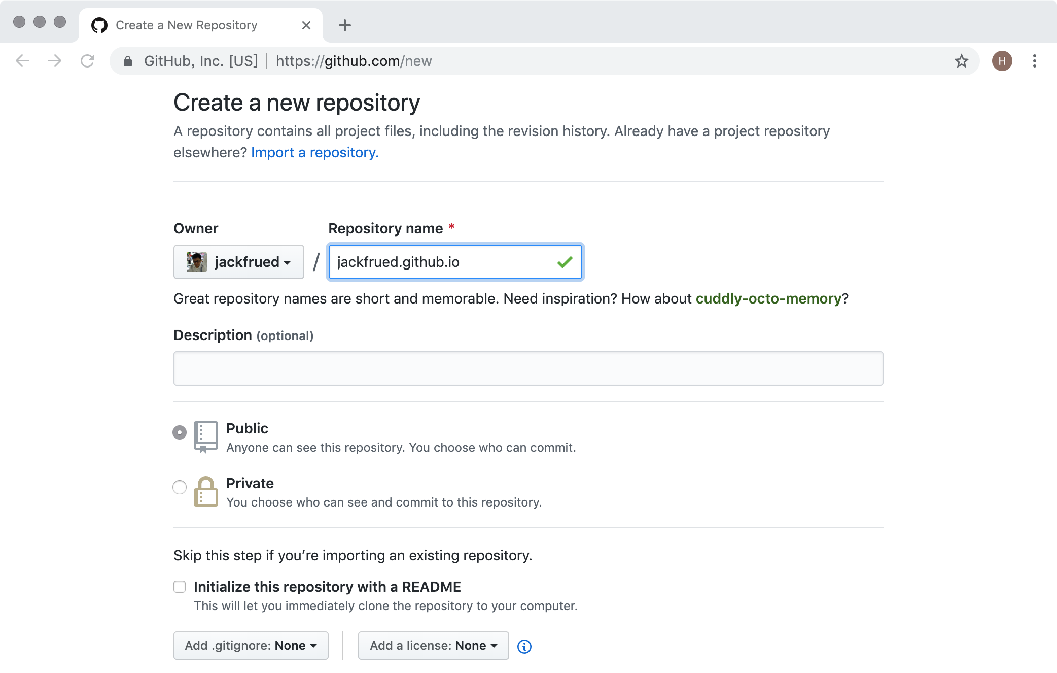 根据自己的用户名创建一个仓库,仓库一定要取名为“用户名.github.io”。例如:我在GitHub上的用户名是jackfrued,那么我的托管博客项目的仓库一定要命名为jackfrued.github.io。