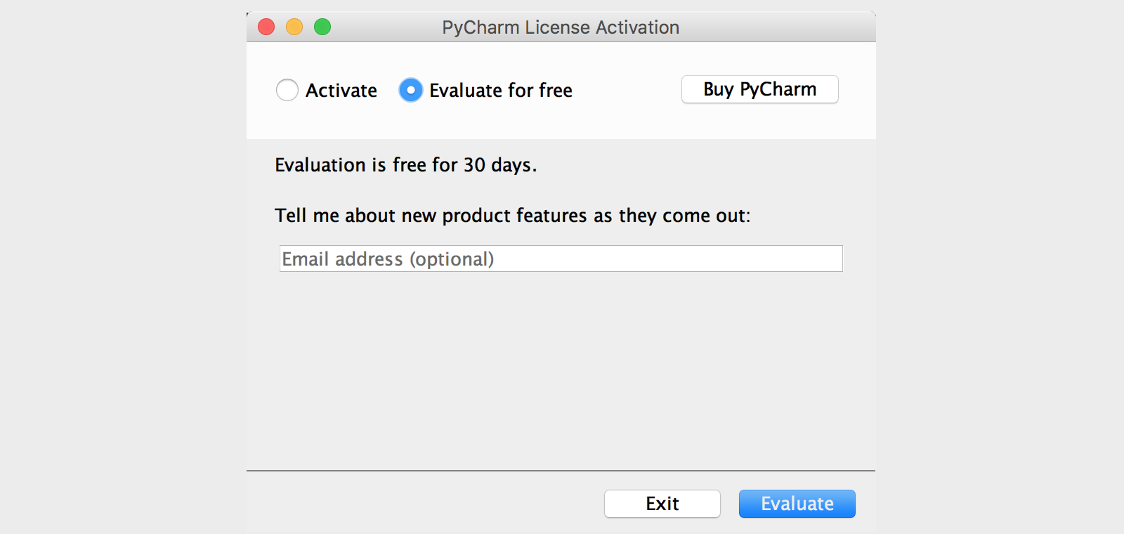 专业版的PyCharm是需要激活的,强烈建议大家在条件允许的情况下支付费用来支持优秀的产品,如果不用做商业用途或者不需要使用PyCharm的高级功能,我们可以暂时选择试用30天或者使用社区版的PyCharm。如果你是一名学生,希望购买PyCharm来使用,可以看看教育优惠官方申请指南 (opens new window)。如下图所示,我们需要点击“Evaluate”按钮来试用专业版PyCharm。