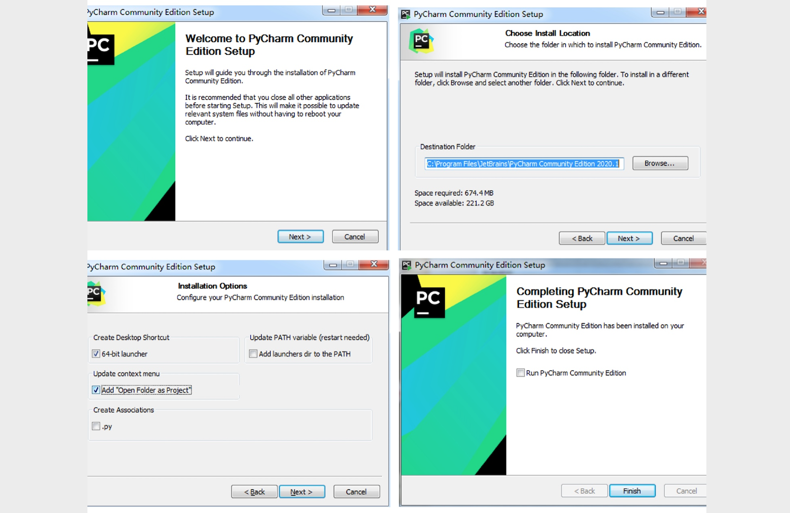 可以在JetBrains公司的官方网站 (opens new window)找到PyCharm的下载链接 (opens new window),有两个可供下载的版本,一个是社区版(PyCharm CE),一个是专业版(PyCharm Professional)。社区版在Apache许可证下发布,可以免费使用;专业版在专用许可证下发布,需要购买授权后才能使用,但新用户可以试用30天。很显然,专业版提供了更为强大的功能和对企业级开发的各种支持,但是对于初学者来说,社区版已经足够强大和好用了。安装PyCharm只需要直接运行下载的安装程序,然后持续的点击“Next”(下一步)按钮就可以啦。下面是我在Windows系统下安装PyCharm的截图,安装完成后点击“Finish”(结束)按钮关闭安装向导,然后可以通过双击桌面的快捷方式来运行PyCharm。