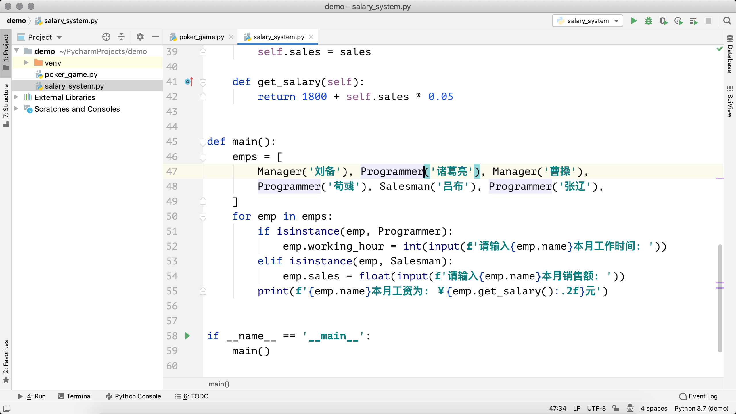 项目创建完成后就可以开始新建各种文件来书写Python代码了,如下图所示。左侧是项目浏览器,可以看到刚才创建的项目文件夹以及虚拟环境文件夹。我们可以在项目上点击鼠标右键,选择“New”,在选择“Python File”来创建Python代码文件,下图中我们创建了两个Python文件,分别是poker_game.pysalary_system.py。当然,如果愿意,也可以使用复制粘贴的方式把其他地方的Python代码文件复制到项目文件夹下。